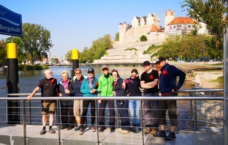 10 Radler trafen sich am 1. Mai um 8:25 Uhr auf dem Bahnhof. Im Zug nach Halle war unsere Aufgabe Mainelken zu basteln. Das war gar nicht so leicht. Unser Muster schenkten wir dem Schaffner. Das Ergebnis kann sich sehen lassen (alle mit Nelke :-).In Brachwitz querten wir die Saale mit der Fähre.Der Saaleradweg ging vorbei an Burgen und blühenden Landschaften. … und wir hatten ordentlichen Gegenwind.84 Kilometer per Fahrrad von Halle nach Calbe (Saale) haben uns einen riesen Spaß gemacht. Danke, es war ein großartiger Tag. Zur nächsten Tour -->